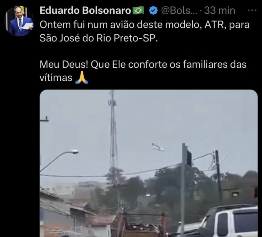 Brasil – O deputado federal Eduardo Bolsonaro (PL-SP) esteve em um avião ATR apenas um dia antes de uma aeronave do mesmo modelo cair em Vinhedo, no interior de São Paulo, nesta sexta-feira (9).