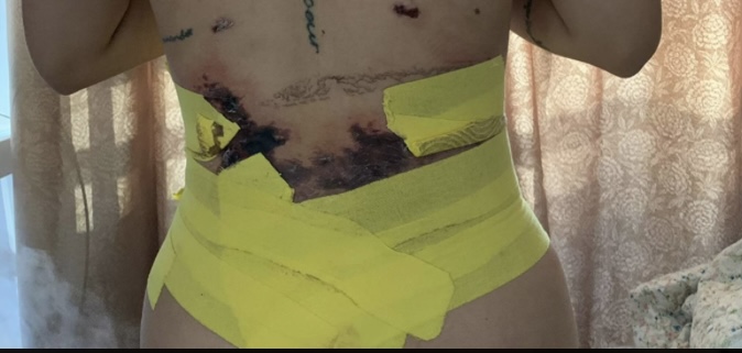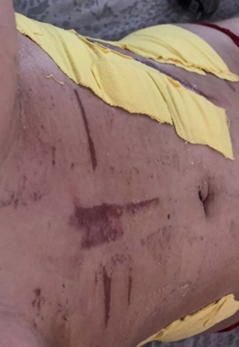 Insegura com relação às complicações do pós-operatório, a empresária procurou outro cirurgião plástico para examinar suas lesões. O médico descobriu que havia necrose de grau elevado em grande área no dorso, na altura da cintura e necrose de menor intensidade na região espinha ilíaca esquerda e supra umbilical,
