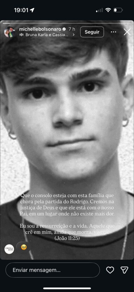 Na publicação, Michelle Bolsonaro prestou condolências aos familiares e afirmou confiar na justiça divina. “Que o consolo esteja com esta família que chora pela partida do Rodrigo. Cremos na justiça de Deus”, escreveu, ao citar o versículo João 11:25.
