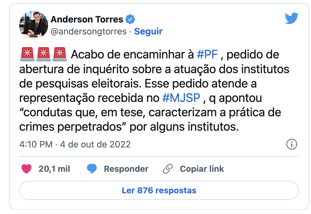 Brasil – O ministro da Justiça, Anderson Torres, enviou à Polícia Federal um pedido de abertura de inquérito para apurar em que condições os institutos de pesquisas eleitorais atuaram neste pleito.