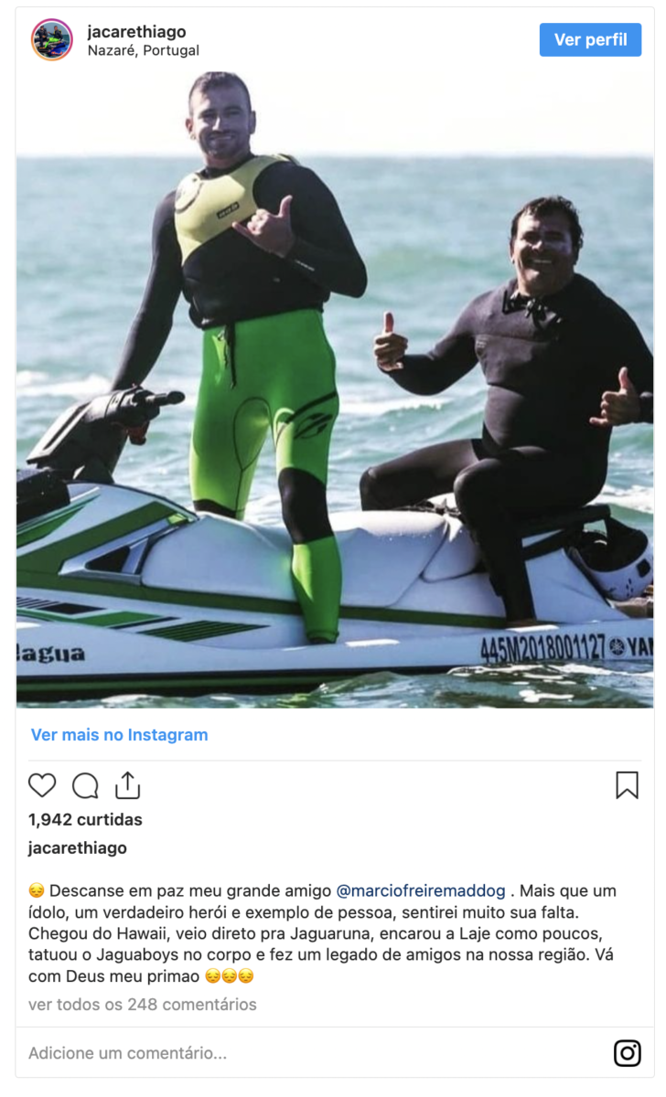 Brasil – Márcio Freire, surfista de ondas gigantes, morreu nesta quinta-feira (05). Ele tinha 47 anos e sofreu acidente ao descer uma dessas mega ondas na praia do Norte, em Nazaré, Portugal. Ele chegou a ser resgatado por uma moto-aquática, mas teria sofrido parada cardiorrespiratória. Seu corpo será transportado para o IML de Leiria, segundo informou a imprensa portuguesa.