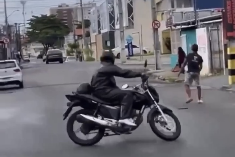 “Tá seguindo a mulher porque seu maníaco? Não tem vergonha na cara? Se quer mostrar que é macho na rua, então aguenta apanhar”, disse o motoqueiro enquanto dava uma lição no homem.