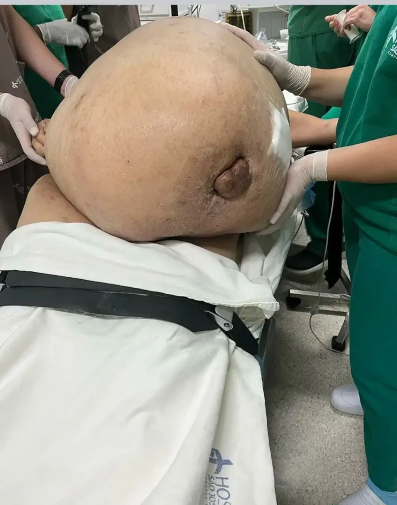 Conforme relato da família da mulher. Ela deu entrada na unidade de saúde com falta de ar devido a tumoração e foi encaminhada para uma cirurgia de urgência.