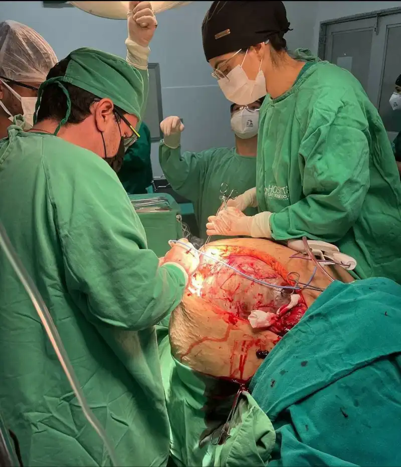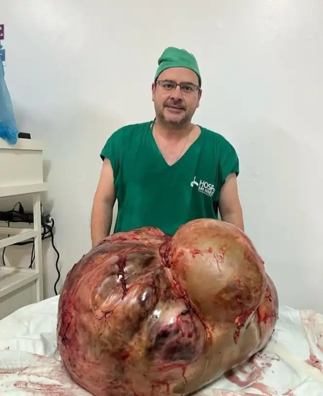 Brasil – Imagens impressionantes publicadas pelo cirugião Glaucio Boechat mostram um tumor gigante, pesando 46 kg, retirado do abdômen de uma paciente no Hospital São José do Avaí, em Itaperuna, no Noroeste Fluminense. Segundo ele, a paciente é uma mulher, de 45 anos. A cirurgia durou cerca de 2 duas horas.