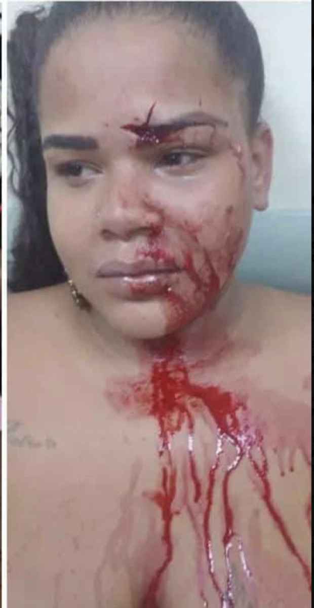Nas imagens, é possível ver o desesperado da vítima no momento em que a trans lhe dá uma cabeçada. O golpe foi tão forte que o supercílio da vítima abriu e ela ficou encharcada de sangue.