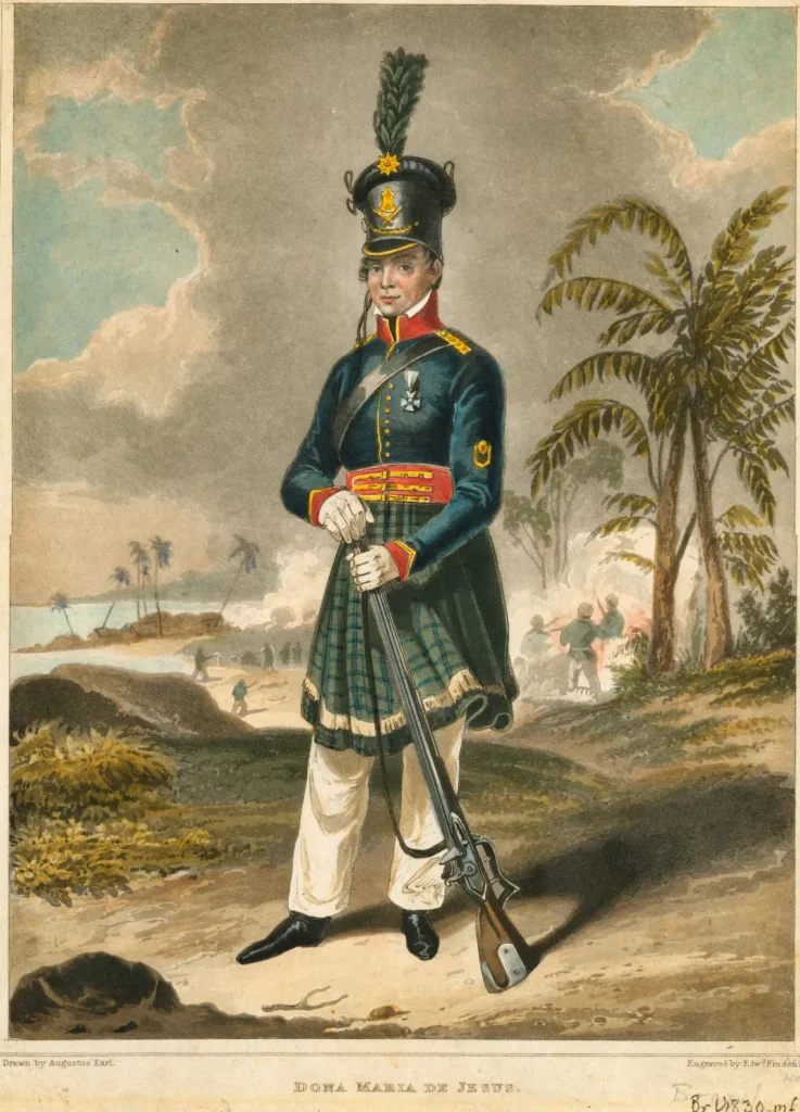 Maria Quitéria de Jesus Medeiros, nascida em 1792 na Bahia, alistou-se disfarçada de homem no exército em 1822, lutando pela Independência. Como “Soldado Medeiros”, destacou-se contra tropas portuguesas e foi condecorada por Dom Pedro I. Sua bravura militar, no entanto, é pouco exaltada além de menções esparsas.