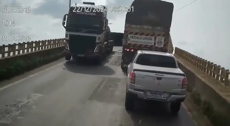 As imagens, cedidas pela WebTV Jaguar News, mostram com mais nitidez o momento em que a estrutura cede. Veículos que atravessavam a ponte, entre eles caminhões e uma motocicleta, são arremessados com o colapso. Em uma das cenas mais impactantes, o motociclista aparece suspenso no ar por instantes antes de ser levado pela força do desabamento.