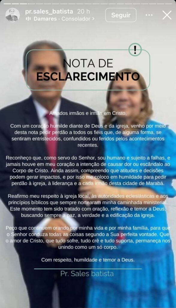 Na nota, Sales Batista afirma que se dirige à igreja “com um coração humilde diante de Deus” e pede perdão aos fiéis que se sentiram entristecidos ou feridos pelos acontecimentos recentes. O pastor diz não ter tido a intenção de causar escândalo e reforça que o momento está sendo tratado com oração, reflexão e temor a Deus. Ao final, pede orações por sua vida e por sua família.