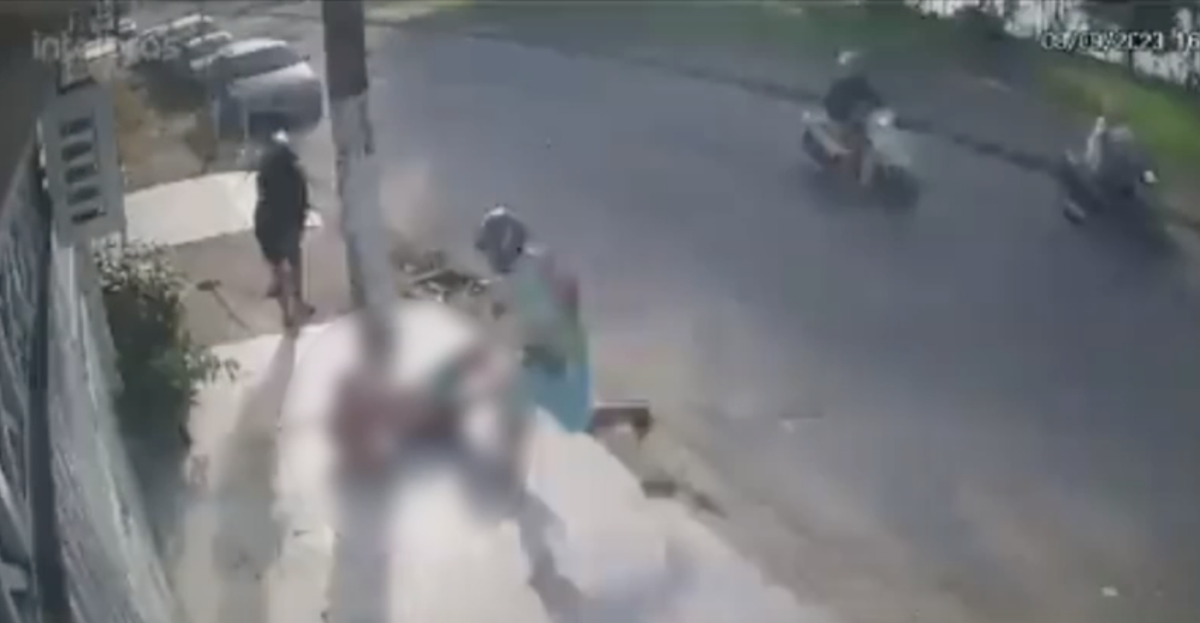 O vídeo mostra Gerson varrendo o chão em frente à sua casa quando dois criminosos em uma motocicleta se aproximam em alta velocidade.
