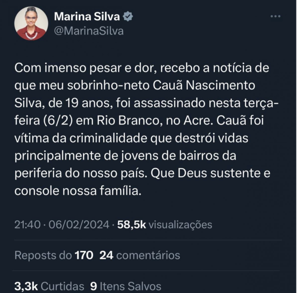 “Com imenso pesar e dor, recebo a notícia de que meu sobrinho-neto Cauã Nascimento Silva, de 19 anos, foi assassinado nesta terça-feira (6/2) em Rio Branco, no Acre. Cauã foi vítima da criminalidade que destrói vidas principalmente de jovens de bairros da periferia do nosso país. Que Deus sustente e console nossa família.”