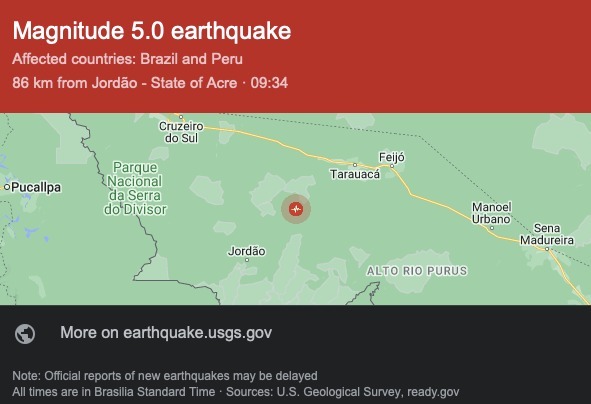 Brasil – O município de Tarauacá no Acre foi atingindo por um terremoto de magnitude 5.0 nesta sexta-feria (11). Segundo o portal Painel Global, a terra tremeu a 88 km da cidade por volta das 07h30, considerado um abalo moderado.