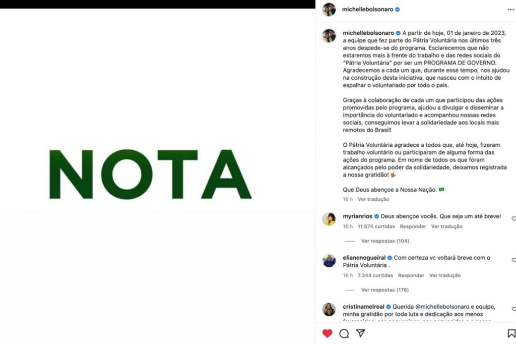 “A partir de hoje, 01 de janeiro de 2023, a equipe que fez parte do Pátria Voluntária nos últimos três anos despede-se do programa. Esclarecemos que não estaremos mais à frente do trabalho e das redes sociais do “Pátria Voluntária” por ser um PROGRAMA DE GOVERNO.
