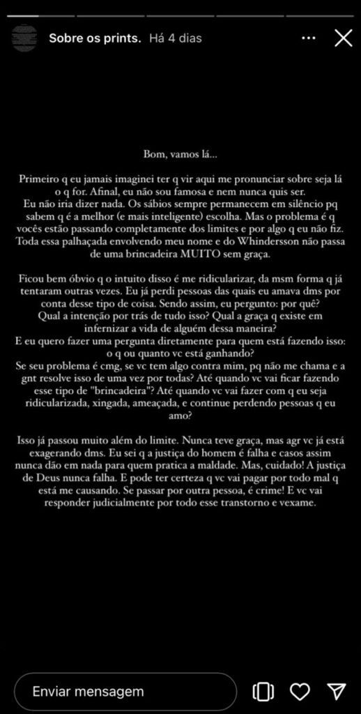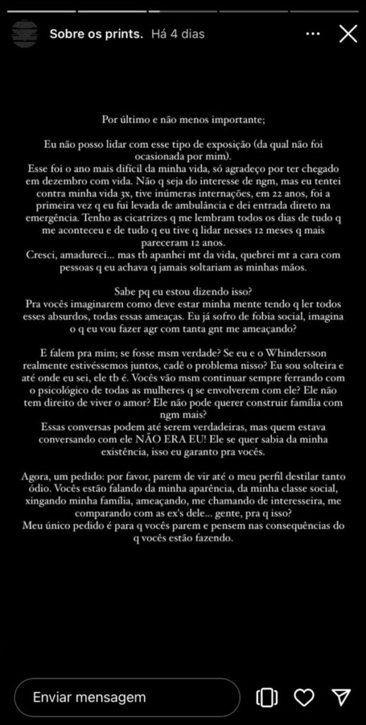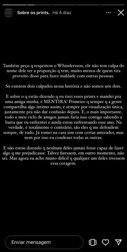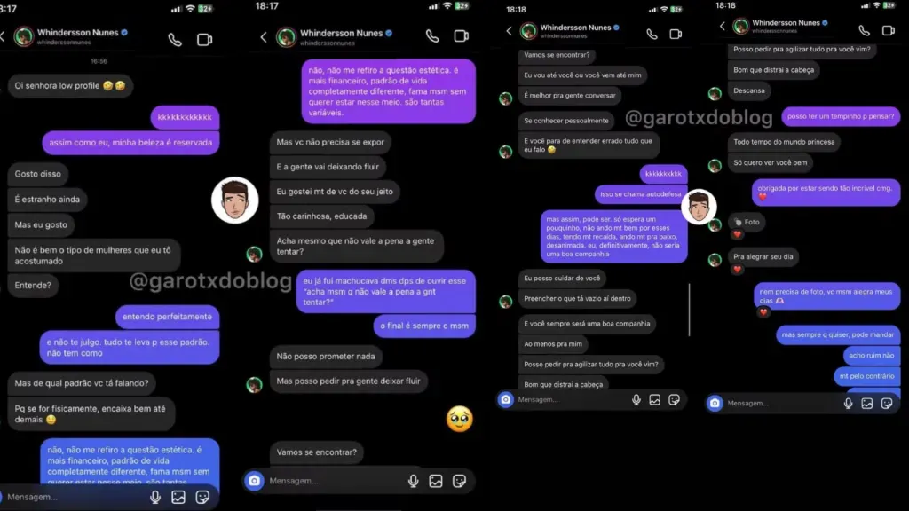 O alvoroço surgiu nas redes, depois que um perfil publicou o suposto bate-papo entre eles, com a chamada: “Veja: São divulgados prints de conversas de Whindersson Nunes com sua nova affair.