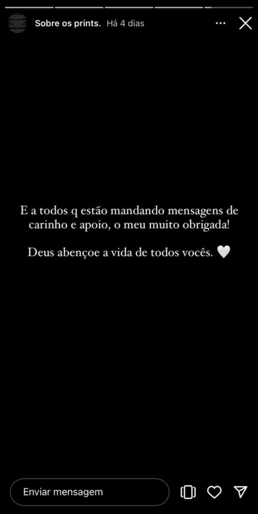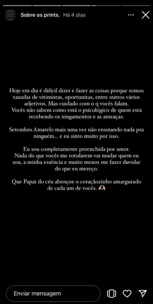 Em outro trecho, a jovem implora para que as pessoas parem de ir até seu perfil destilar tanto ódio. “Vocês não sabem como está a cabeça de quem está recebendo ofensas e ameaças”.