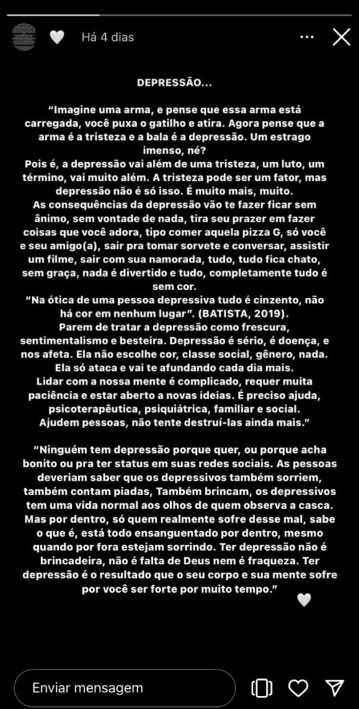 ”Esse foi o ano mais difícil da minha vida, só agradeço por ter chegado até dezembro com vida. Não que seja do interesse de ninguém, mas eu tentei contra a minha vida 3x, tive inúmeras internações. Em 22 anos, foi a primeira vez que fui levada de ambulância e dei entrada direto na emergência”, desabafou Jéssica.