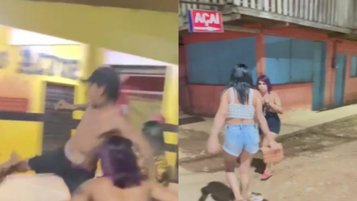 “Vai! Pega o teu tijolo. Se tu é homem, tu bate aqui no meu peito”, diz. Neste momento, uma ruiva defende o homem, e diz que ele não vai agredir mulher. Durante a provocação, as duas acabam se atacando no soco e a morena saca uma arma branca a fim de esfaquear a ruiva. Em seguida, o homem chega na voadora pra apartar a briga.