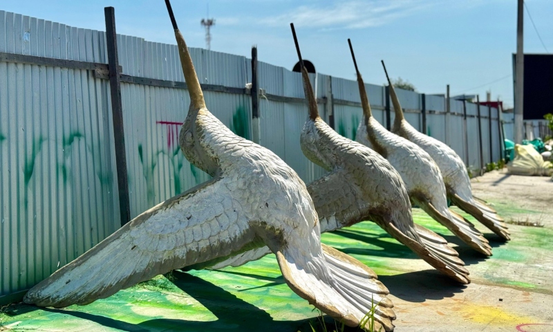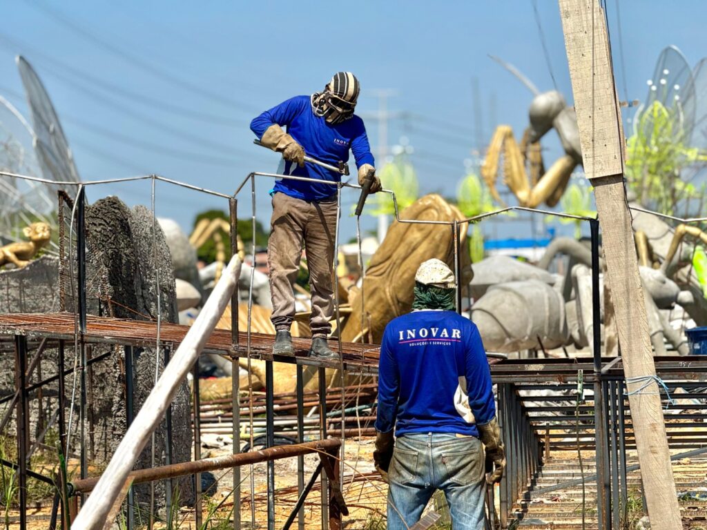 “Esta é a parte botânica do parque, e estamos dando andamento no alicerce da área dos pássaros, do cenário das aves. Como aqui temos muitos elementos fibrados (fibra de vidro), será mais rápida a montagem. E por fim, temos o ninho das aves, que se encontra na parte de estrutura metálica. As aves estão todas fibradas, prontas para serem pintadas, assim como a parte decorativa. Só falta construir a base para que possa ser montado e feitos os acabamentos artísticos”, explicou Wady Amoedo, responsável pelo canteiro de obras.