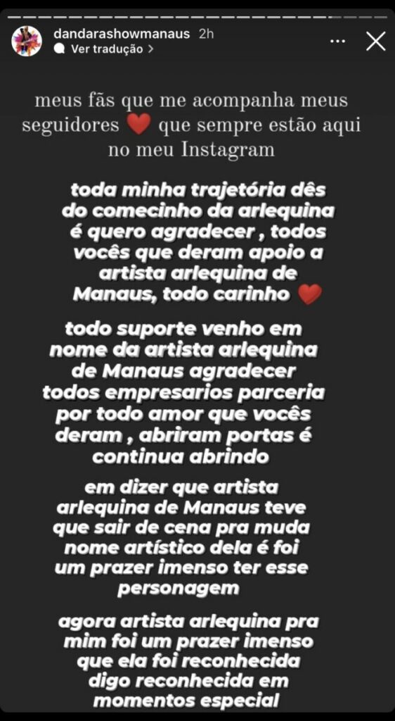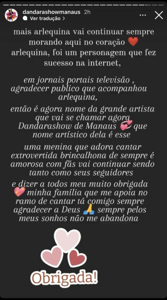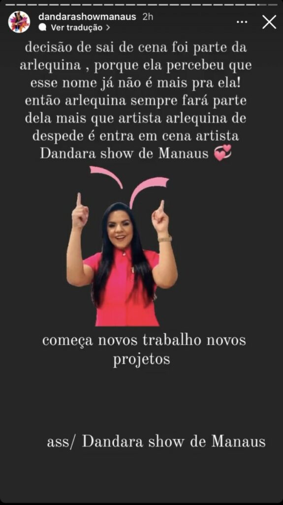 Em nota, Arlequina diz que neste momento se despede da personagem e agradece a todos os empresários e parceiros que abriram as portas para que ela fosse reconhecida, mas que agora nasce uma nova artista: “Dandara Show”.