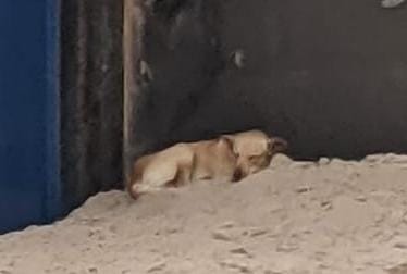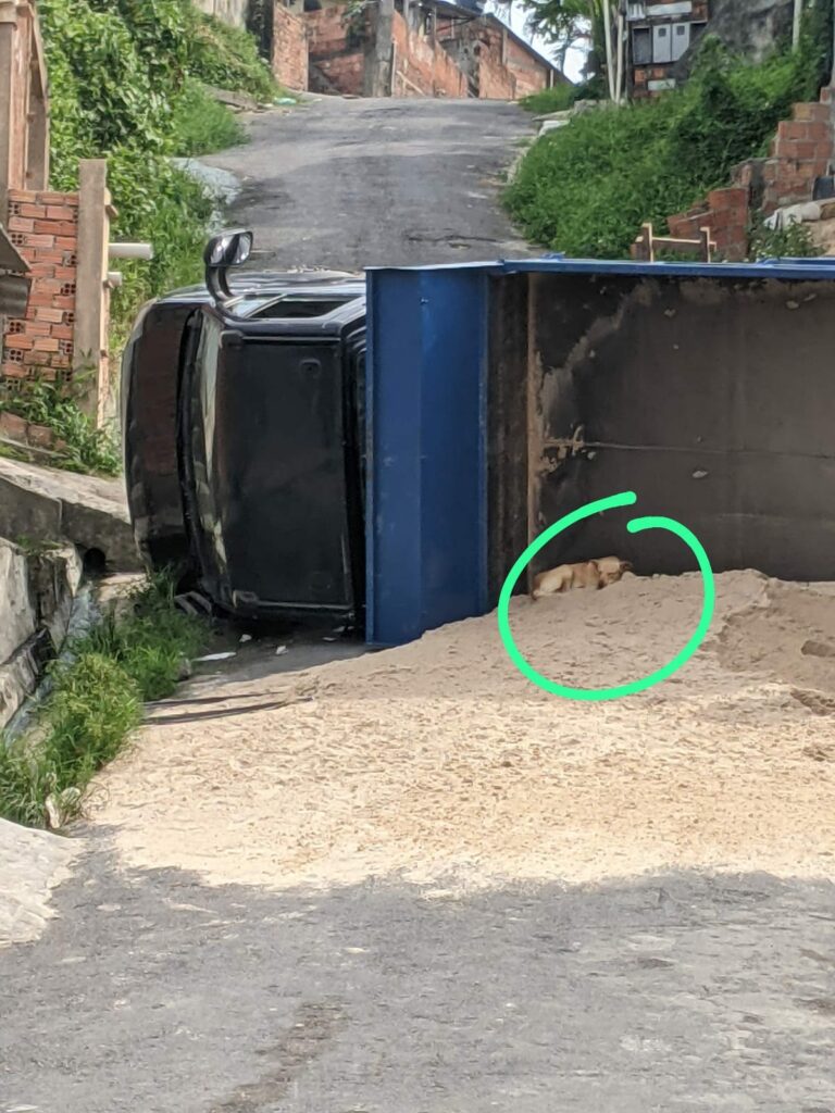 Enquanto moradores socorriam o motorista, um idoso que saiu ileso do acidente, um cachorro caramelo, famoso por sua presença em várias partes da cidade, surgiu e deitou confortavelmente na areia espalhada dentro da caçamba tombada.
