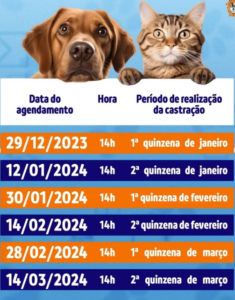 A castração é feita em animais com idade mínima de cinco meses e o serviço é ofertado mediante agendamento prévio.