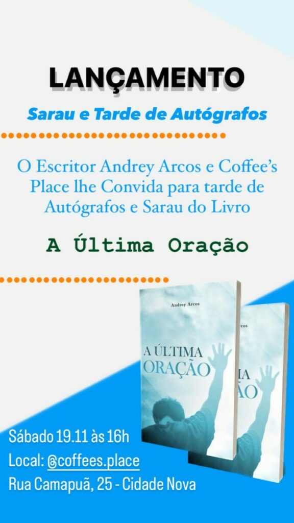 Manaus – O escritor e pastor Andrey Lucio Oliveira Arcos, promove sarau para o lançamento de seu primeiro livro ”A Última Oração” publicado pela editora Lucel. O evento irá ocorrer neste sábado (19), no Coffes Place, localizado na rua Camapuã, bairro Cidade Nova, zona Norte de Manaus.