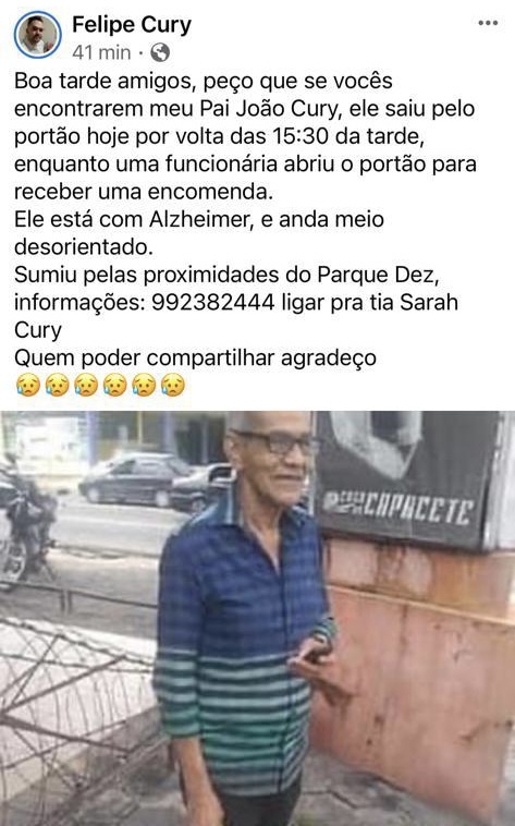 Qualquer informação que possa ajudar no paradeiro de seu João, entrar em contato com a filha, Sarah Cury, através do número (92) 99238-2444.