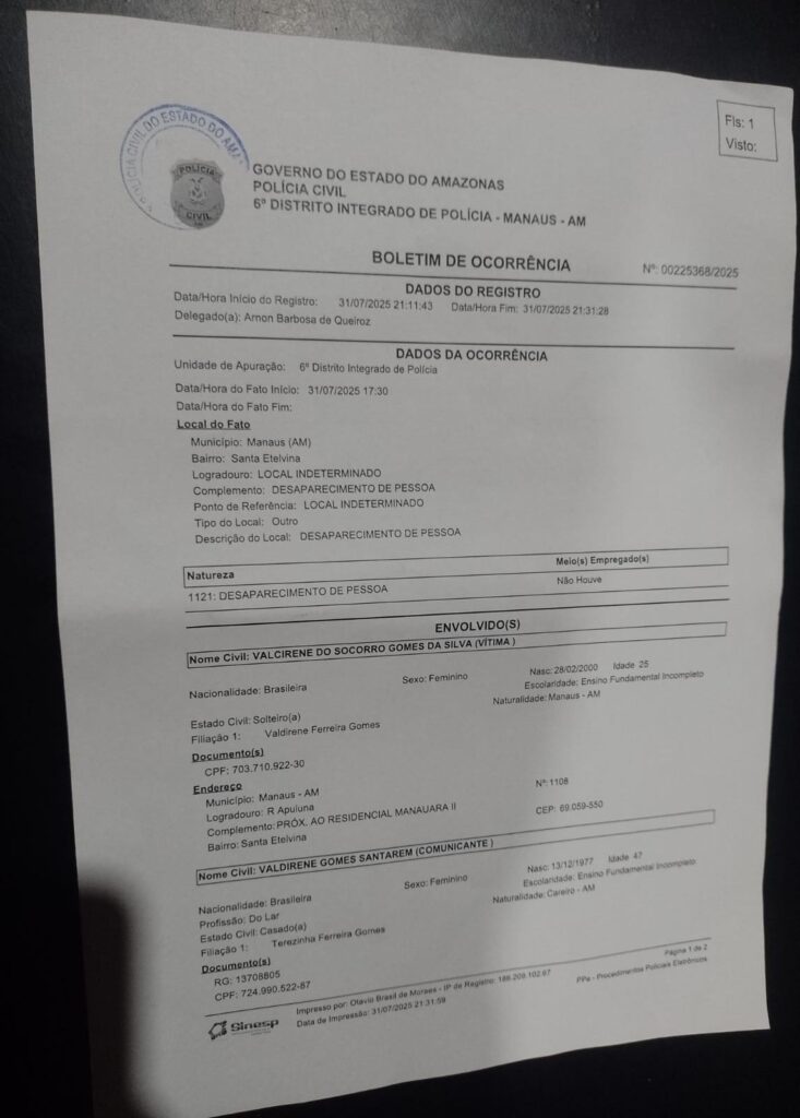 Amazonas – A angústia tomou conta de uma família no bairro Santa Etelvina, zona norte de Manaus, após o desaparecimento de uma jovem identificada como Valcirene do Socorro Gomes da Silva, ocorrido no fim da tarde desta quinta-feira (31).