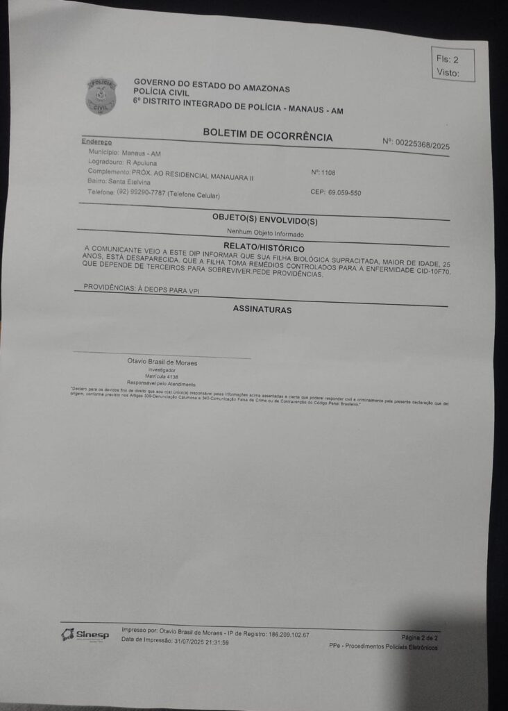 As investigações seguem em andamento. Se alguém viu Valcirene ou tem qualquer informação, pode também ligar 92 99290-7787 ou para o Disque Denúncia da Polícia Civil pelo 181.