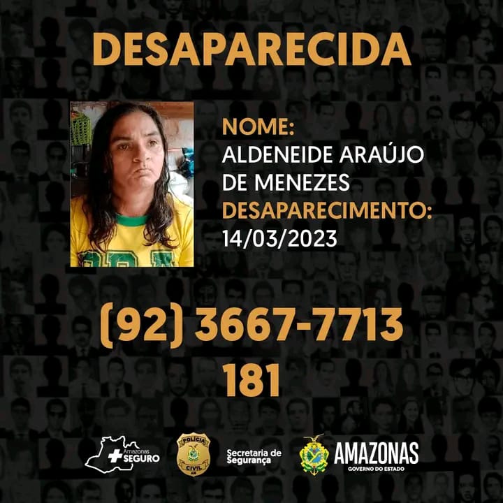 Aldeneide Araújo de Menezes, 45, está desaparecida desde terça-feira (14/03), por volta de 19h30, após sair de sua residência, localizada na rua Planeta Struve, bairro Tarumã, zona oeste.
