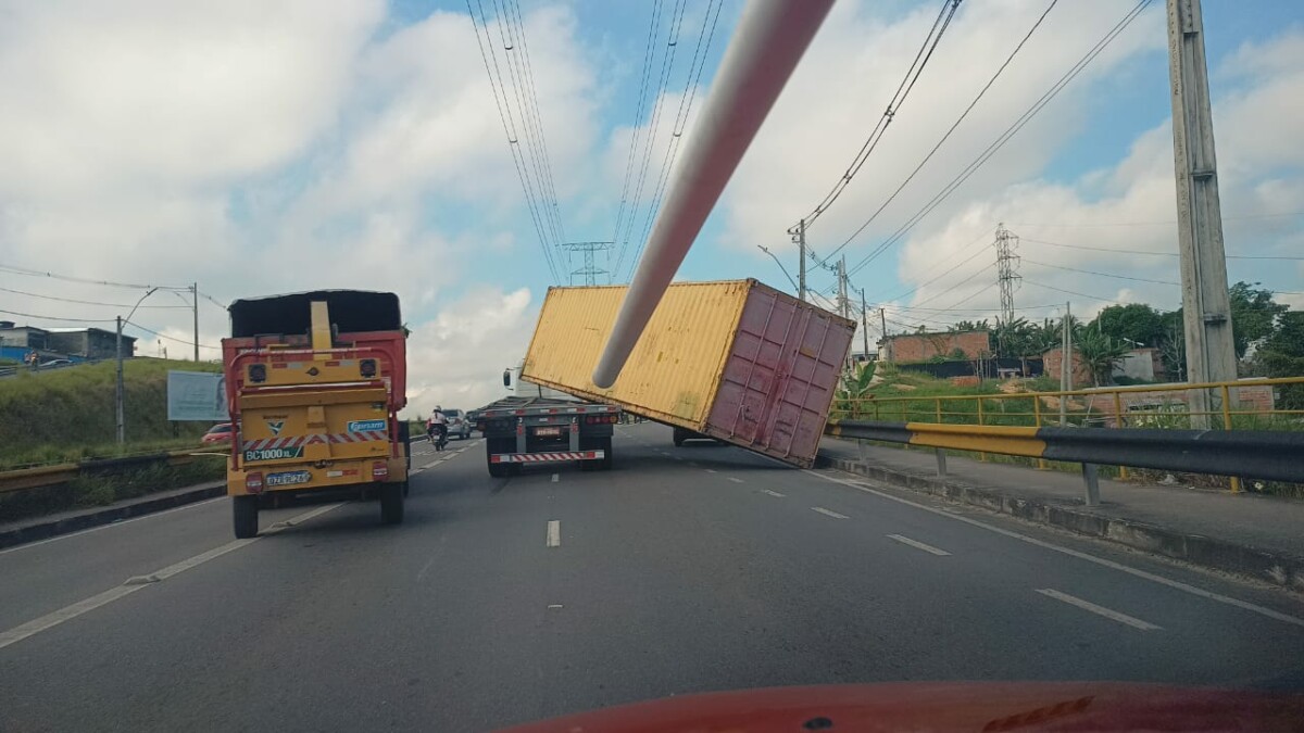 Manaus – Na manhã desta quarta-feira (21) o baú de um caminhão acabou caindo parcialmente do veículo e por pouco não esmagou um carro de passeio. O caso aconteceu na Avenida das Flores, zona Norte de Manaus.