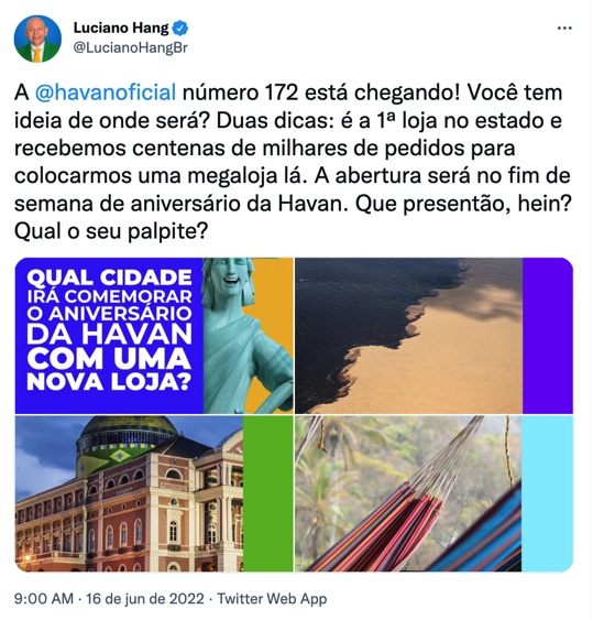 O dono da Havan, Luciano Hang, enfatiza que está muito feliz em comemorar o aniversário da empresa chegando em novo estado. “Quando a Havan chega em uma região, ela transforma aquela cidade. Levamos empregos e oportunidade para muitas pessoas. Essa loja em Manaus estava sendo muito aguardada pelo povo manauara. Comemorar essa data tão importante com mais essa conquista me deixa muito feliz e grato”, finaliza.