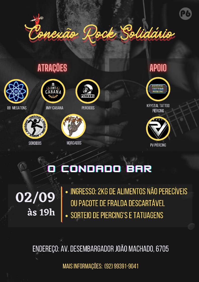 Manaus – No dia 02 de setembro acontece o ‘Conexão Rock Solidário’ no Condado Bar, localizado na Avenida Desembargador João Machado, no bairro Alvorada, na zona Centro-Oeste de Manaus. O intuito do evento é arrecadar alimentos e produtos de higiene para abrigos situados na capital amazonense.