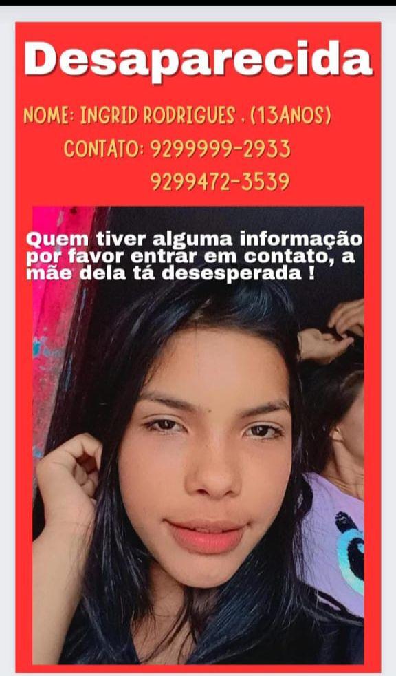 Manaus – A adolescente de 14 anos, identificada como Ingrid de Almeida Ribeiro, desapareceu nesta segunda-feira (10) após deixar o irmão na creche no conjunto Riacho Doce II, bairro Cidade Nova, localizada na zona Norte de Manaus.