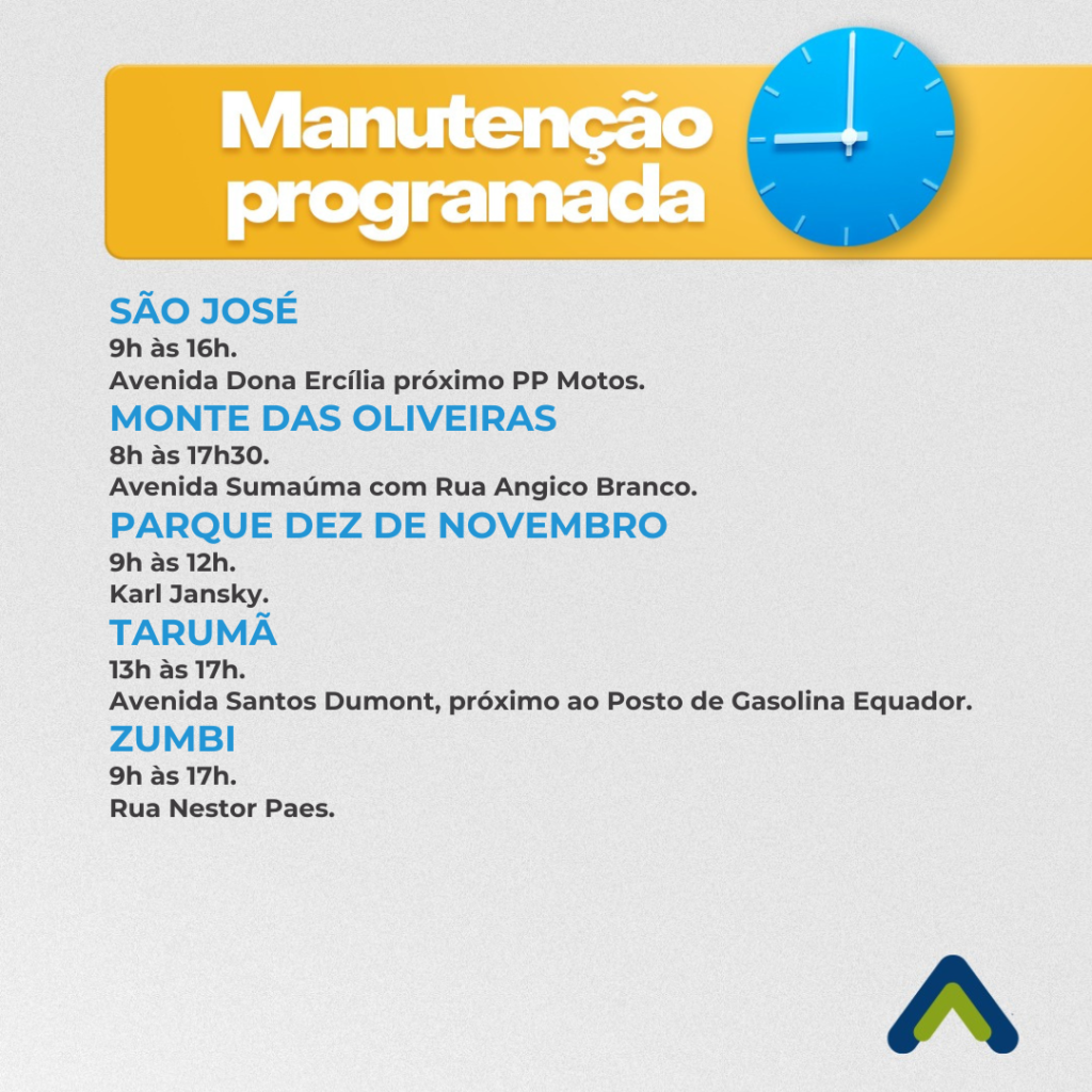 As áreas afetadas serão São José, Monte das Oliveiras, Parque 10, Tarumã, Zumbi e Cidade de Deus.