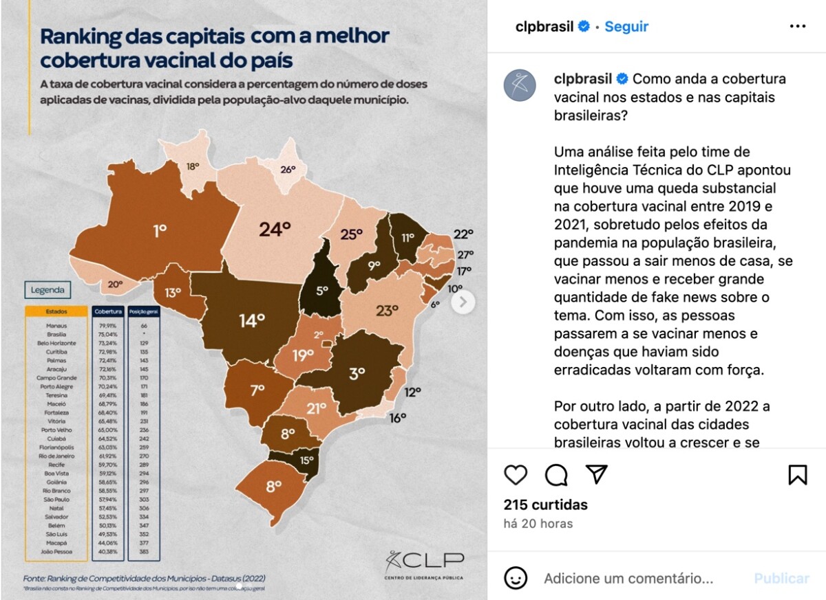 Uma análise do Centro de Liderança Pública (CLP) aponta que a cobertura vacinal nas cidades brasileiras teve uma queda substancial entre 2019 e 2021, principalmente devido aos efeitos da pandemia. No entanto, a partir de 2022, os índices começaram a se recuperar, graças a campanhas de mobilização, investimentos em mídia para incentivar a vacinação, a diminuição da pandemia e políticas públicas inovadoras, como a expansão dos horários de vacinação. Foi o caso da capital amazonense, que se saiu melhor que todos os demais estados do Brasil.