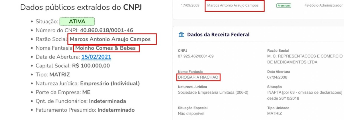 Em uma pesquisa rápida em busca do CNPJ do restaurante, foi possível identificar que o dono do estabelecimento é Marcos Antônio Araújo Campos, que também é proprietário da Drogaria Riachão.