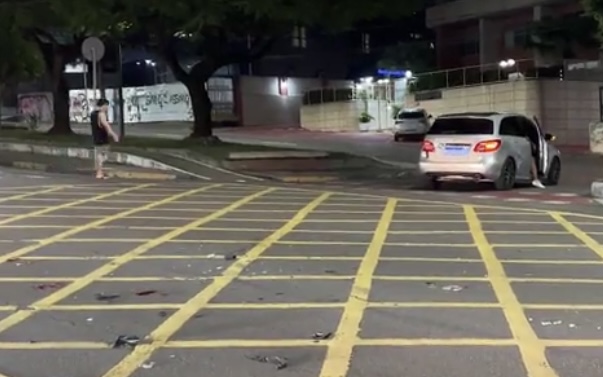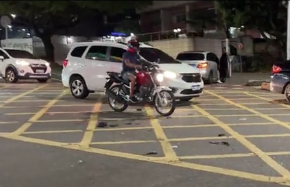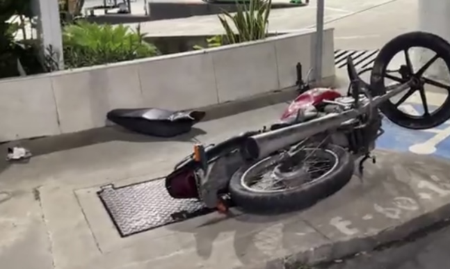 Com o impacto da colisão, a motocicleta rodopiou na pista e parou nas proximidades da calçada, já o carro parou no canteiro central.