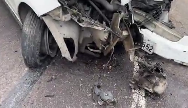 O carro, modelo Siena, de cor branca, ficou totalmente destruído com o impacto da colisão.