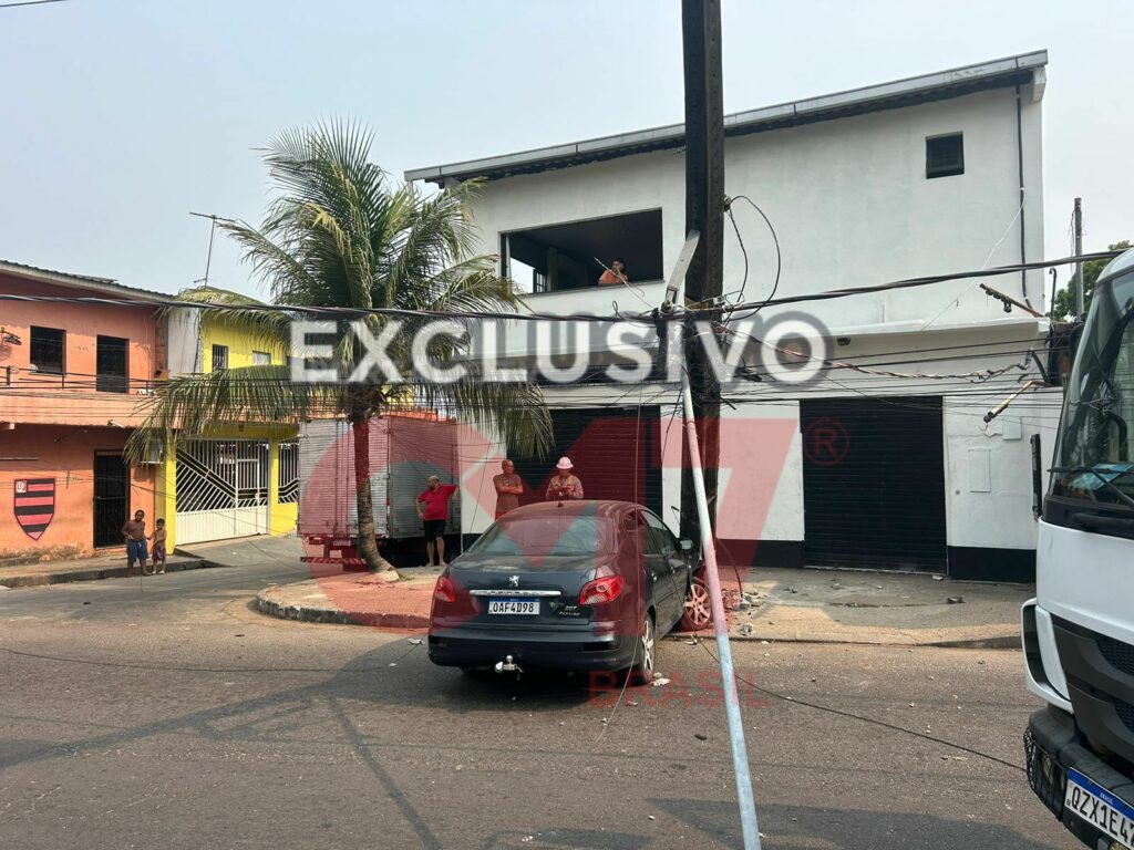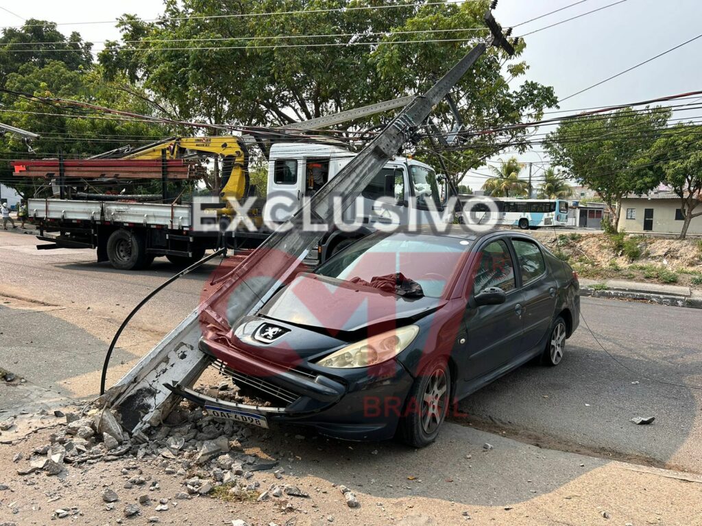 Motorista perde o controle de carro e destrói poste no Igarapé do Passarinho em Manaus; veja vídeo