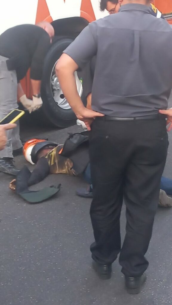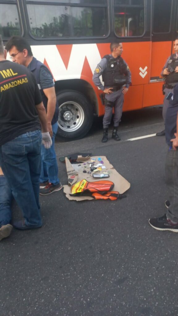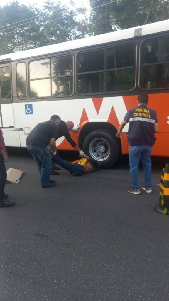 A vítima teve a cabeça presa nas rodas do ônibus e morreu na hora mesmo fazendo uso de capacete.