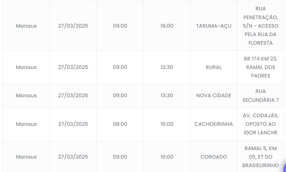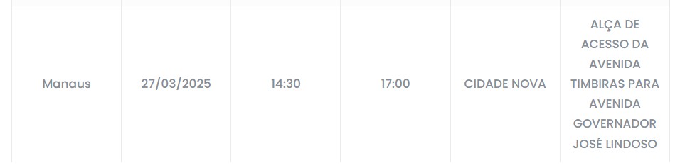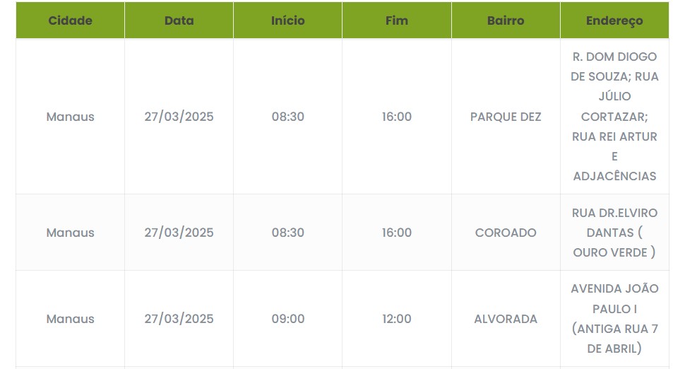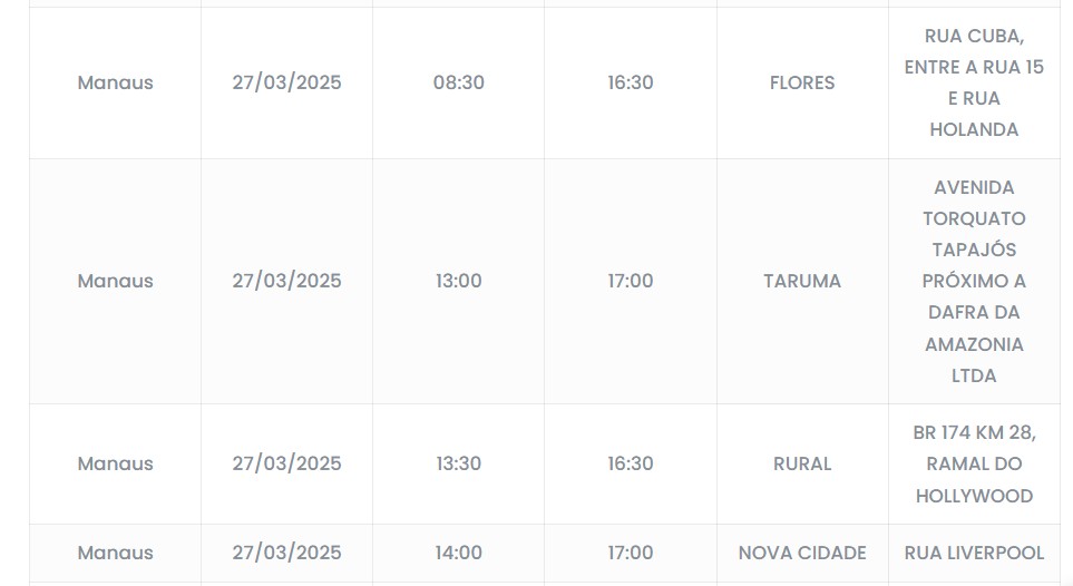 Manaus – Na quinta-feira (27), nove bairros de Manaus terão o fornecimento de energia interrompido devido a uma manutenção programada na rede elétrica. A interrupção poderá durar algumas horas, mas ainda não há previsão exata para o retorno da normalização do serviço.