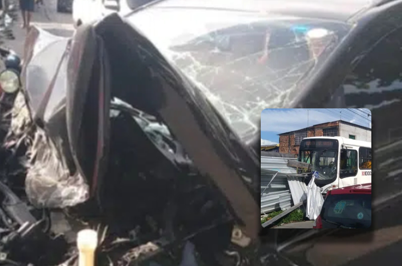 Batida violenta deixa carro destruído e ônibus invade terreno no Novo Aleixo; veja vídeos
