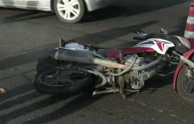 O condutor da moto perdeu o controle da direção após o o pneu ter furado e acabou caindo no chão.