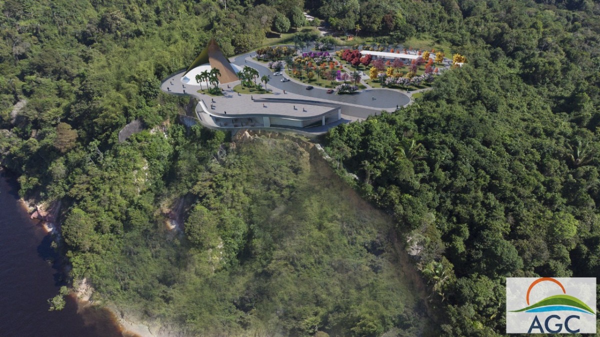 A cúpula do projeto remete a uma oca e a edificação não tem interferência na paisagem espetacular. São duas hastes, em concreto, que sobem e se encontram, simbolizando os dois rios, com cores diferentes.