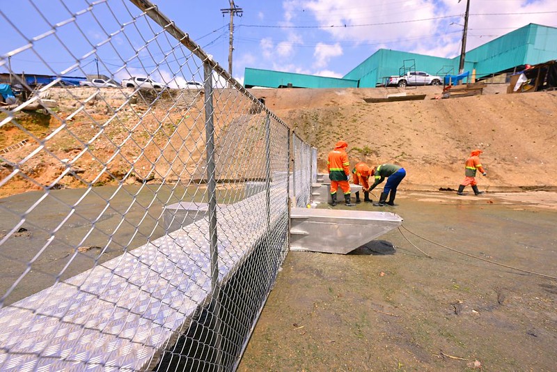 Manaus – O prefeito David Almeida, acompanhado do secretário municipal de Limpeza Urbana, Sabá Reis, instalou nesta sexta-feira (7/11) a maior ecobarreira já implantada em Manaus. Com três módulos de 12 metros cada – totalizando 36 metros de extensão –, a estrutura foi fixada no igarapé do Educandos, próximo à feira da Panair, zona Sul, um dos principais canais de escoamento de resíduos para o rio Negro.