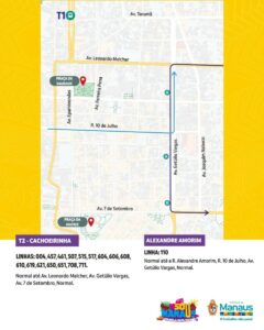 Linhas oriundas do Terminal de Integração da Cachoeirinha 2 (T2) seguirão normalmente pela Leonardo Malcher e depois pela avenida Getúlio Vargas e entram à esquerda na avenida 7 de Setembro para continuar o itinerário normal. Farão este itinerário as linhas: 004, 457, 461, 507, 515, 517, 604, 606, 608, 610, 619, 621, 650, 651, 708 e 711.