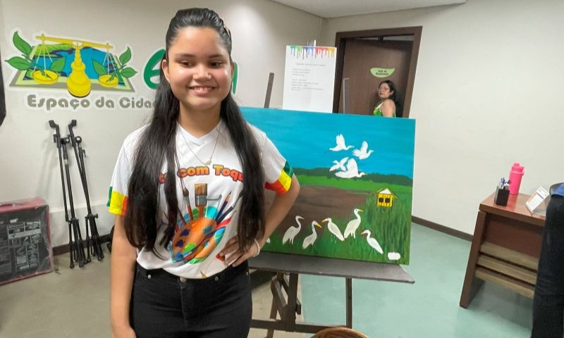 Para a artista Júlia Abreu, de 18 anos, autora da obra que retrata “O voo das garças na beleza amazônica”, a pintura a ajudou e motivou a fazer algo diferente.