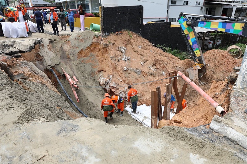 “Aqui aconteceu um rompimento de uma drenagem profunda que tinha mais de 15 anos. Na época, foi feita apenas com tubo de concreto sem ferro na sua armação, e agora estamos trocando para tubos mais resistentes com aço na sua estrutura, que é o concreto armado, e deve durar por 40 anos. Esse é um problema de 20 anos atrás e o prefeito David Almeida, com seu dinamismo, determinou que a Secretaria de Obras resolva em até quatro dias”, afirmou o secretário de Obras, Renato Junior.