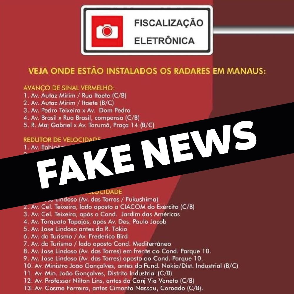 Manaus – A Prefeitura de Manaus e o Instituto Municipal de Mobilidade Urbana (IMMU) esclarecem que a lista de pontos de radares eletrônicos que tem sido compartilhada nas redes sociais, datada de 2014, não é mais aplicável para o ano de 2024 e, portanto, trata-se de informação incorreta. Tal lista está sendo erroneamente compartilhada em grupos de aplicativos de mensagens e redes sociais e já foi categorizada como fake news.