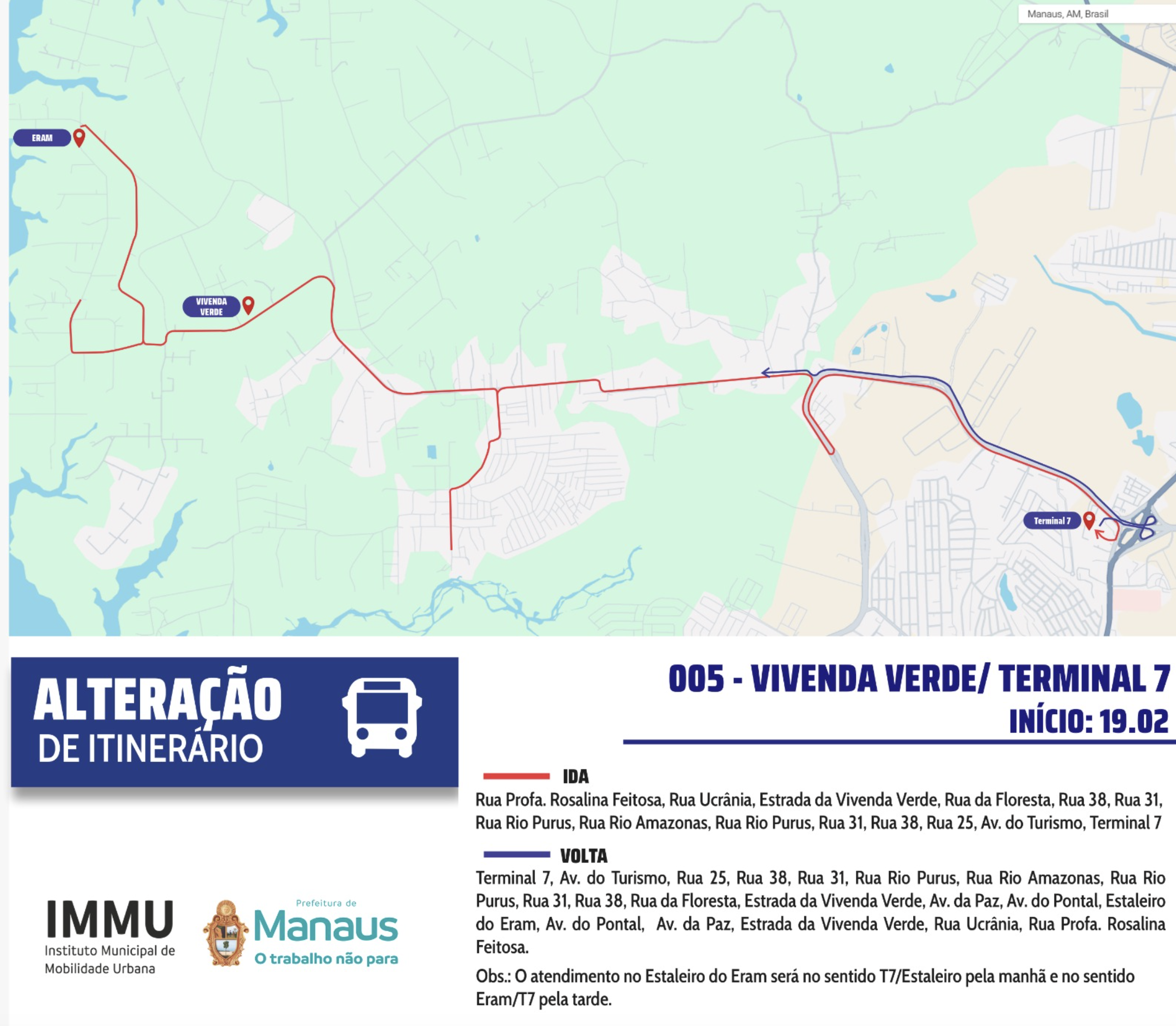 Para melhorar a eficiência e o tempo de viagem, a linha 005 terá seu itinerário alterado a partir desta quinta-feira. O ajuste visa garantir um atendimento mais preciso às áreas da estrada da Vivenda Verde e o estaleiro do Eram.